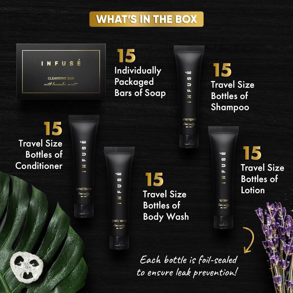 Infuse Black Soaps & Toiletries Bulk Set, 1 oz Shampoo, Conditioner, Body Wash, Lotion, 1.25 oz Cleansing Bar, Lavender Mint - 75 Pieces