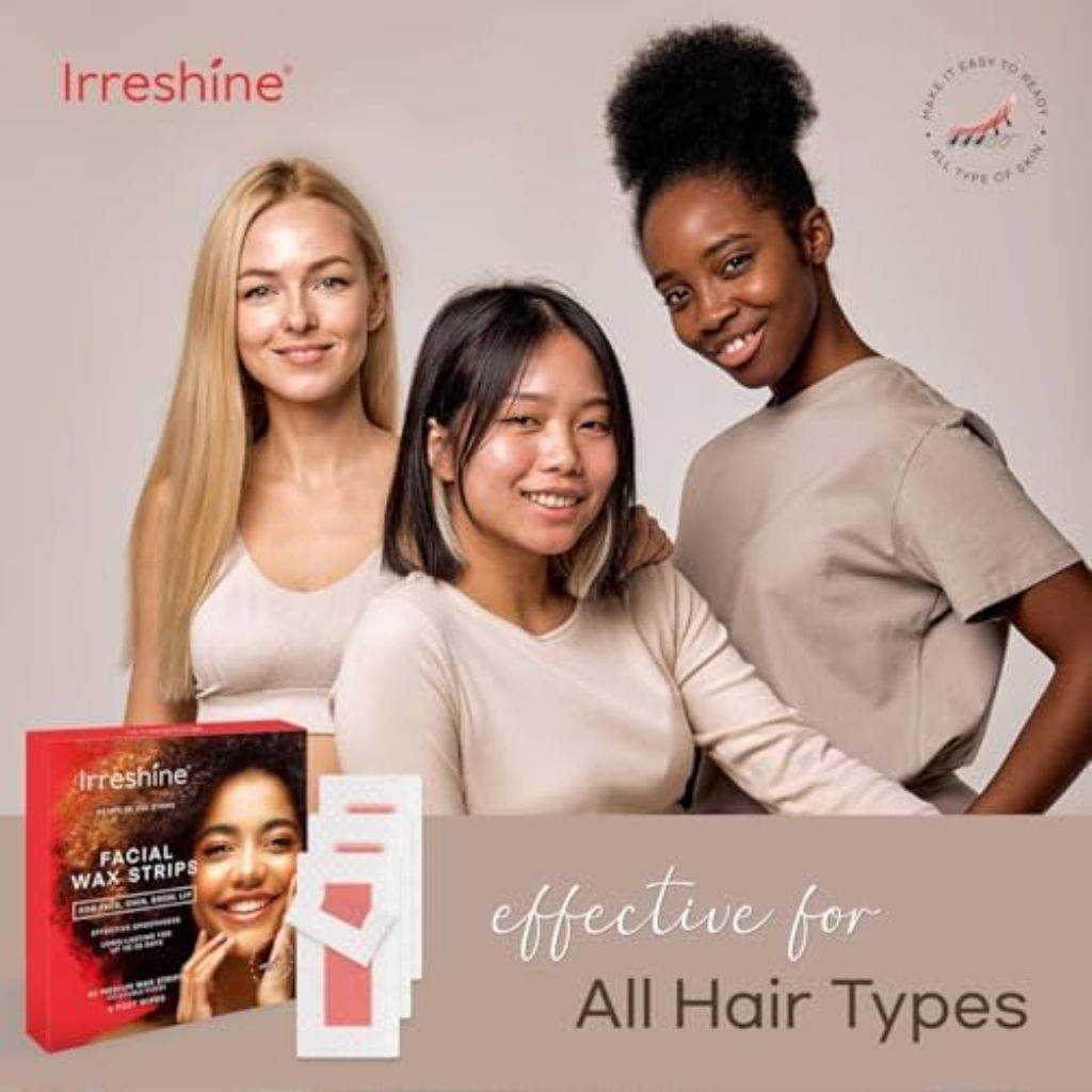 Irreshine Facial Wax Strips for Upper Lip, Eyebrow, Chin - 40 Medium Strips with 6 Wipes