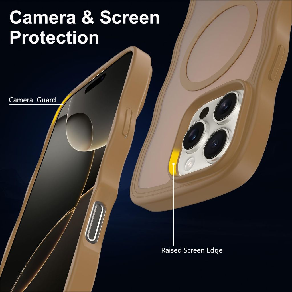 The Jockvo Cute Wave Design Case is a protective cover designed specifically for the iPhone 16 Pro. It features a distinctive wavy edge design that enhances grip and provides a comfortable, stylish hold. The case is constructed from a thick, translucent matte TPU material that resists fingerprints and yellowing while subtly showcasing the phone's original color. It incorporates a built-in magnetic ring for full MagSafe compatibility, ensuring a secure connection with MagSafe accessories like chargers for faster wireless charging. Engineered for protection, it meets military-grade drop-test standards (MIL-STD-810G) with 360° corner airbags that effectively absorb and disperse impact. Raised bezels around the screen and camera module lift these components off flat surfaces to prevent scratches and damage. The case offers a sleek, minimalist aesthetic with its matte finish and is available in a brown color.