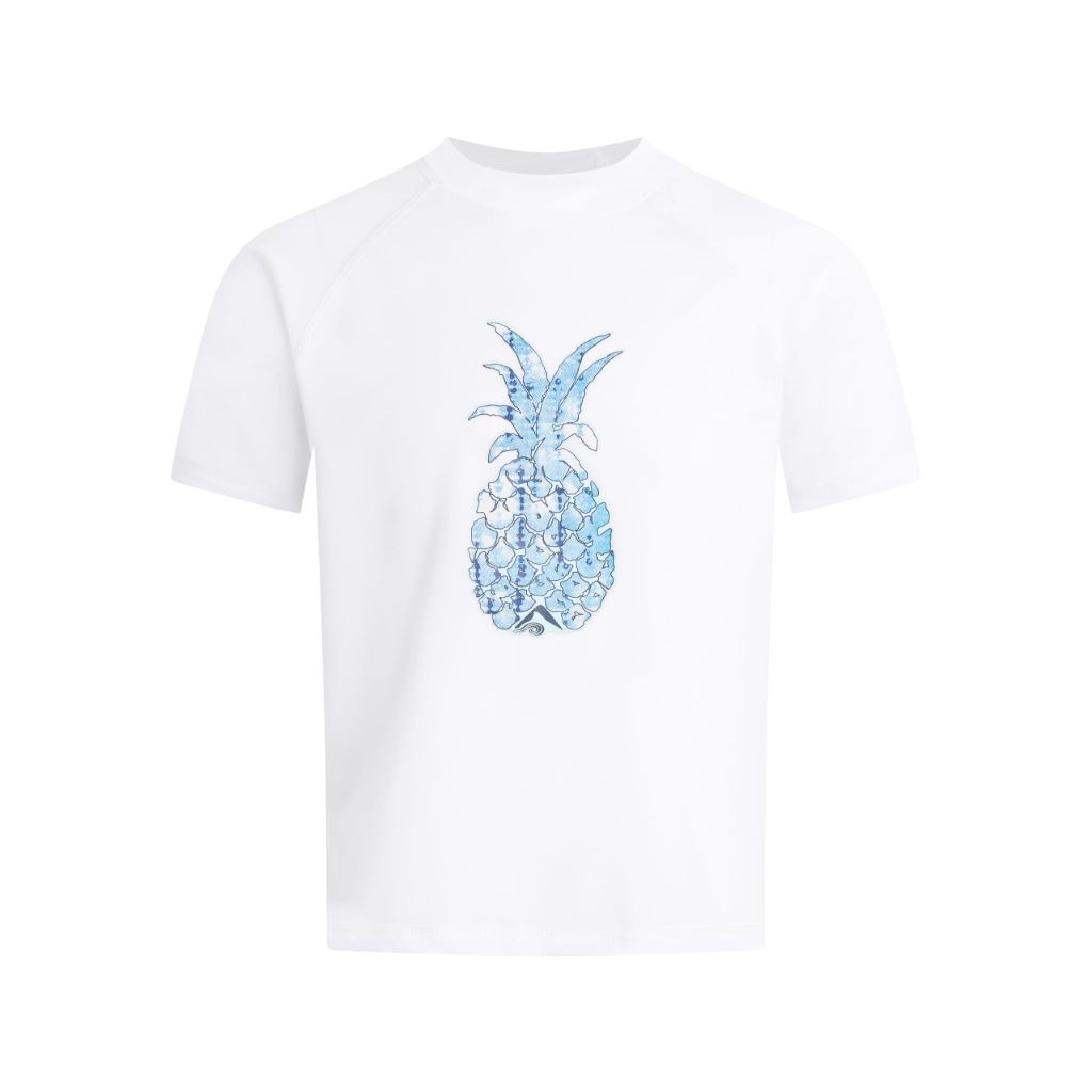 The Kanu Surf Jade UPF 50+ Sun Protective Rashguard Swim Shirt is a girls' swim top designed for sun protection and comfort during water activities. It features a UPF 50+ rating, which blocks over 98% of harmful UVA and UVB rays. The shirt is constructed from a soft, breathable, and quick-drying fabric that wicks moisture away from the skin. It is a short-sleeve style with a crew neckline, designed for a snug yet comfortable fit to allow for ease of movement while surfing, swimming, or playing at the beach or pool. The product is part of the Kanu Surf brand's collection of functional swim and surf apparel. This specific model is in the color 'Willow White' and is sized as a Girls' Small, corresponding to a size 8. It is intended for use as a standalone swim shirt or as a cover-up layer.