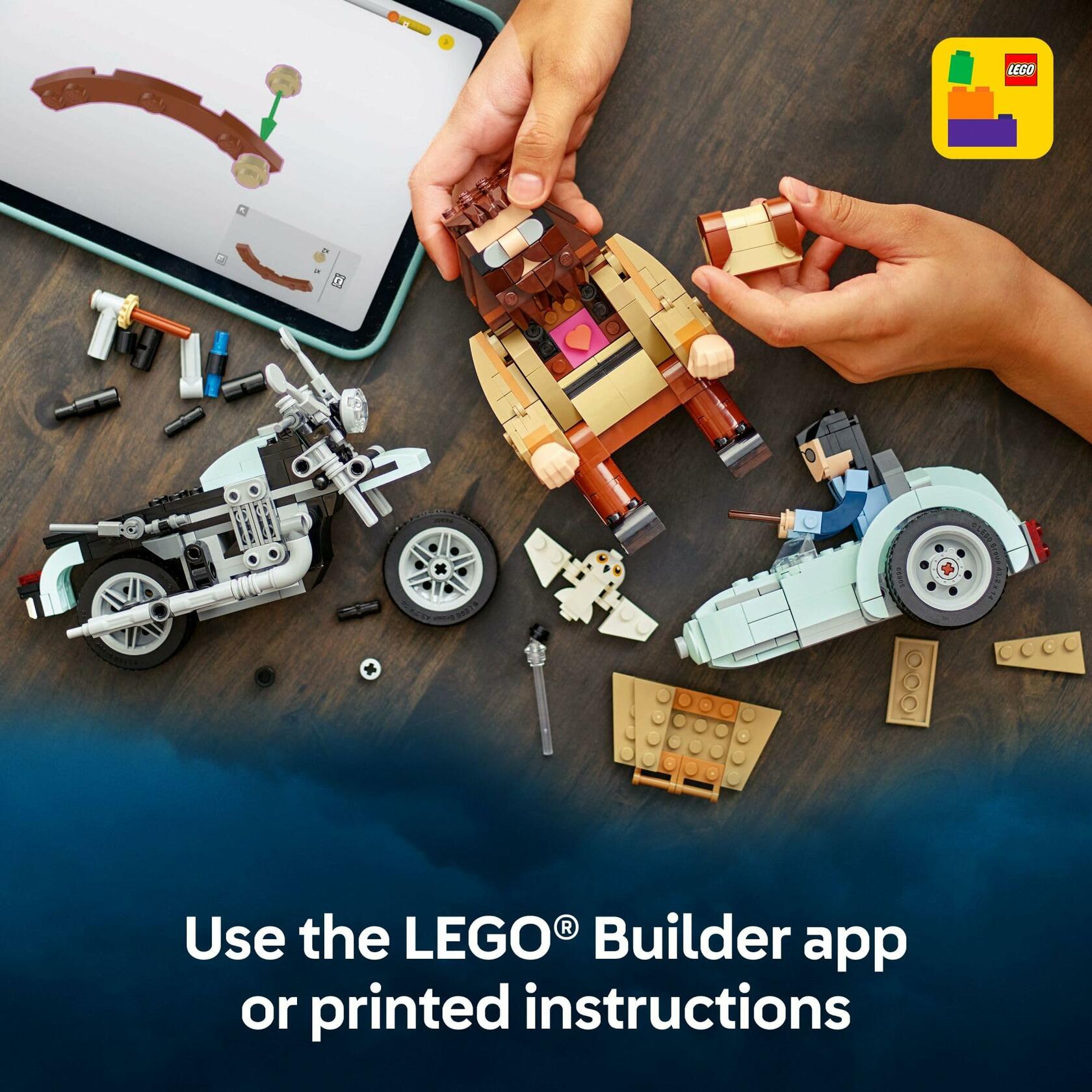 The LEGO Harry Potter Hagrid & Harry's Motorcycle Ride Building Set 76443 is a 617-piece construction set that recreates the iconic flying motorcycle scene from the Harry Potter series. This detailed model features a large, buildable motorcycle with sidecar, complete with stud shooters for action play. The set includes three minifigures: Hagrid, Harry Potter, and a Dementor, each with authentic accessories. Hagrid comes with his signature pink umbrella, while Harry includes his wand. The motorcycle features a sturdy build with detailed elements including exhaust pipes, handlebars, and a sidecar that can accommodate Harry Potter minifigure. The set measures approximately 4 inches (11 cm) high, 11 inches (28 cm) long, and 5 inches (13 cm) wide when completed. Made from high-quality LEGO bricks, this building set offers an engaging construction experience for Harry Potter fans ages 9 and up, allowing them to recreate magical moments from the beloved stories.