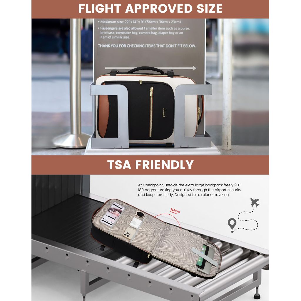 The LOVEVOOK Large Travel Backpack is a versatile carry-on bag designed for air travel. It measures 18 x 14 x 8 inches, making it compliant with the personal item size requirements of many budget airlines, including Spirit, Frontier, and JetBlue. With a 40-liter capacity, the backpack features a suitcase-style opening for easy packing and access. It includes multiple compartments for organization, including a dedicated padded electronics compartment, side pockets for a water bottle or umbrella, and a built-in wet compartment pocket. The backpack is constructed from durable, tear-resistant, water-resistant, and abrasion-resistant materials. For added convenience, it comes with three packing cubes: two storage bags and a shoe bag. Comfort features include adjustable, padded shoulder straps and a padded back panel. A luggage strap on the back allows it to be secured to a rolling suitcase handle.