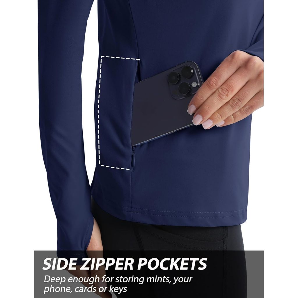 The MAGCOMSEN Women's 1/4 Zip Pullover is a thermal athletic top designed for active wear in cool weather. It features a soft, warm brushed interior fabric that wicks away moisture while remaining breathable and stretchy. The slim-fit design is complemented by a quarter-zip front for adjustable ventilation and easy on/off. Raglan sleeves provide enhanced freedom of movement for the shoulders and arms, and integrated thumb holes help keep sleeves in place and provide additional hand coverage. Two side zipper pockets offer secure storage for small essentials like phones, keys, or cards. This versatile top can be worn as a standalone layer or as a base layer underneath other clothing. It is suitable for various activities including running, hiking, yoga, golf, workouts, and everyday casual use.
