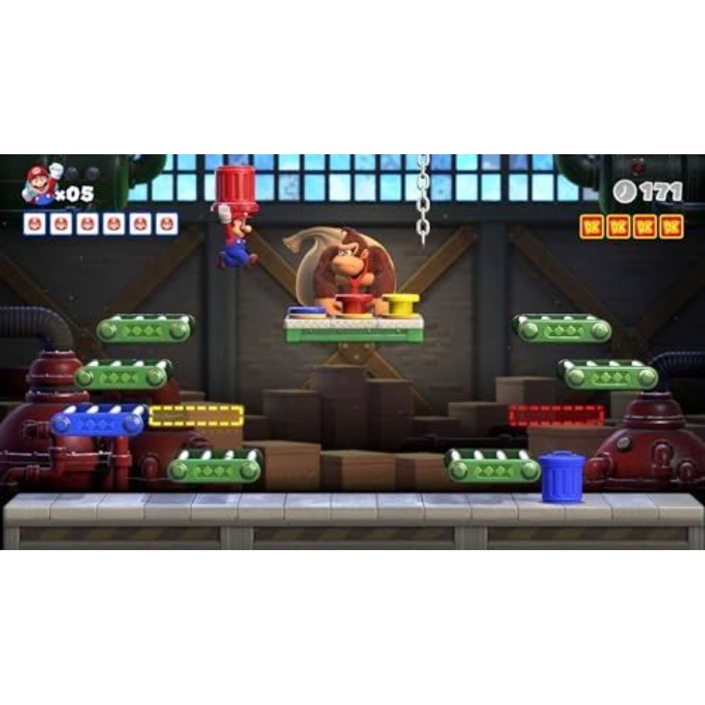 Mario vs. Donkey Kong is a puzzle-platformer video game for the Nintendo Switch system. In this game, Donkey Kong has stolen the Mini-Mario toys, and players must guide Mario through over 130 levels to retrieve them. The gameplay involves solving environmental puzzles by running, jumping, and backflipping while navigating obstacles such as spikes, moving platforms, and falling bricks. Players must utilize various puzzle mechanics including Color Switches and Warp Boxes to progress. The game offers two distinct playstyles: Casual Style, which removes time limits and adds checkpoints for a more relaxed experience, and Classic Style, which replicates the timed, challenging one-hit defeat mechanics of the original Game Boy Advance title. A new Two-Player Mode allows for local cooperative play, where Mario and Toad work together to complete additional objectives.