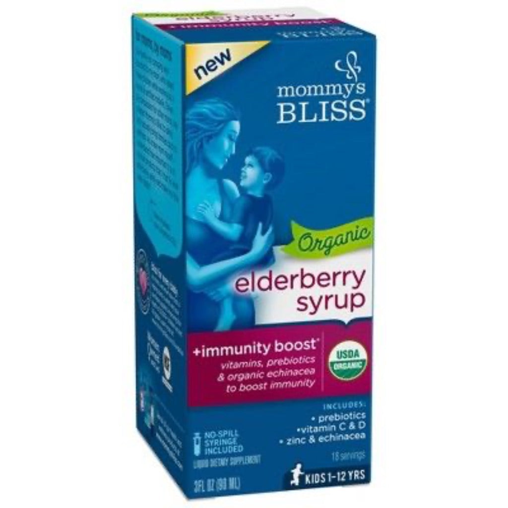 Mommy's Bliss Kids Organic Immunity Syrup is a liquid dietary supplement specifically formulated for children aged 1-12 years. This USDA Organic certified syrup is designed to support healthy immune function with a blend of key ingredients including organic elderberry, organic echinacea, Vitamin C, Vitamin D3, and Zinc. The product features a pleasant, kid-friendly flavor to encourage easy consumption. It contains prebiotic soluble fiber and is free from common allergens including peanuts, wheat, eggs, milk, fish, shellfish, tree nuts, soy, and sesame. The syrup is also free from BPA, PVC, and phthalates, and is non-GMO. Each bottle contains 3 fluid ounces (90 ml) of the immunity-supporting formula. The product is NSF certified and comes from a mom-founded company focused on children's wellness.