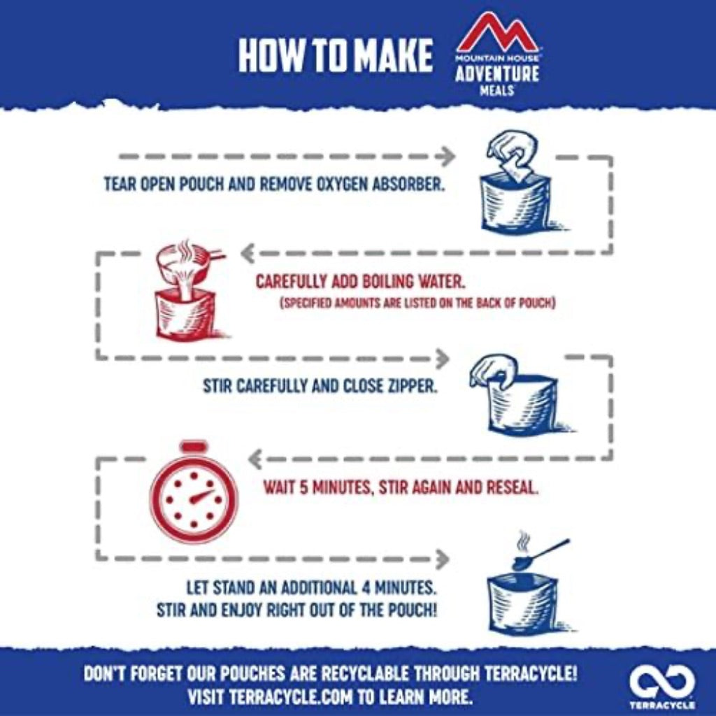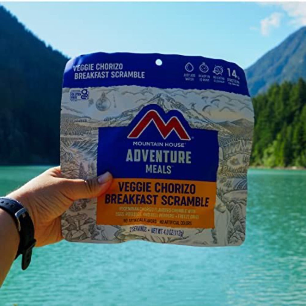 Mountain House Veggie Chorizo Breakfast Scramble is a freeze-dried meal designed for camping, backpacking, and emergency food storage. This vegetarian breakfast option features a savory blend of plant-based chorizo crumbles, scrambled eggs, potatoes, peppers, and onions, all seasoned with Mexican-inspired spices. The meal is prepared by simply adding hot water directly to the pouch, requiring no cooking and minimal cleanup. Each pouch provides a complete, ready-to-eat meal that is lightweight and has an extended shelf life, making it ideal for outdoor activities and preparedness kits. The freeze-drying process helps preserve the flavor, texture, and nutritional value of the ingredients.