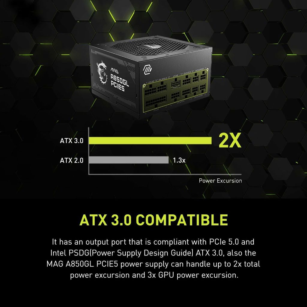MSI MAG A850GL PCIE 5 80 Plus Gold 850W Fully Modular 12VHPWR Cable ATX 3.0 Power Supply
