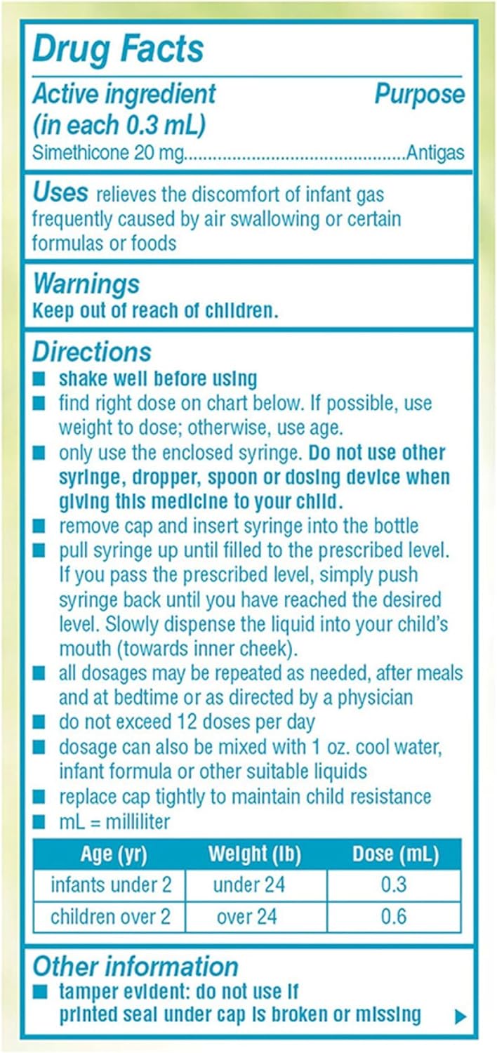 Infants' Mylicon Gas Relief Dye Free is an over-the-counter liquid medication designed to relieve the discomfort of infant gas. This formula is free from alcohol, artificial flavors, saccharin, and gluten, making it suitable for sensitive infants. It is safe for use with newborns and can be administered at every feeding, up to 12 times per day as directed. The product comes with a dosing syringe for accurate measurement and can be mixed with cool water, infant formula, or other suitable liquids. Dosage is based on the child's weight or age, with specific guidelines provided for infants under 24 lbs and children over 24 lbs. The product should be stored at room temperature (68-77°F) and should not be frozen.