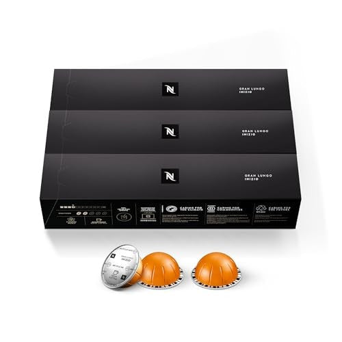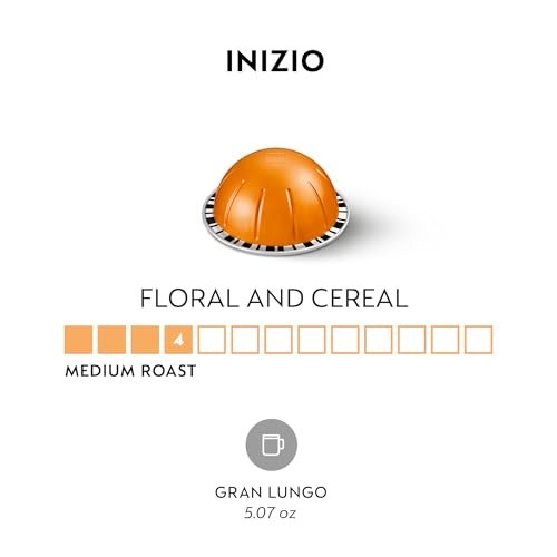 Nespresso Vertuo Inizio is a medium roast coffee capsule designed for use with Nespresso Vertuo brewing systems. Each capsule brews a 5.0 oz (150 ml) cup of coffee. The Inizio blend features a balanced flavor profile with notes of cereal and a subtle fruity acidity, characteristic of a medium roast. The coffee is sourced from a combination of Arabica beans from Latin America and Robusta beans from Africa and Asia. The Vertuo capsule system uses barcode technology to automatically recognize each capsule and optimize brewing parameters (water volume, temperature, and spin speed) for that specific blend. This package contains 30 capsules. The capsules are made of aluminum to preserve freshness and are recyclable through Nespresso's recycling program.