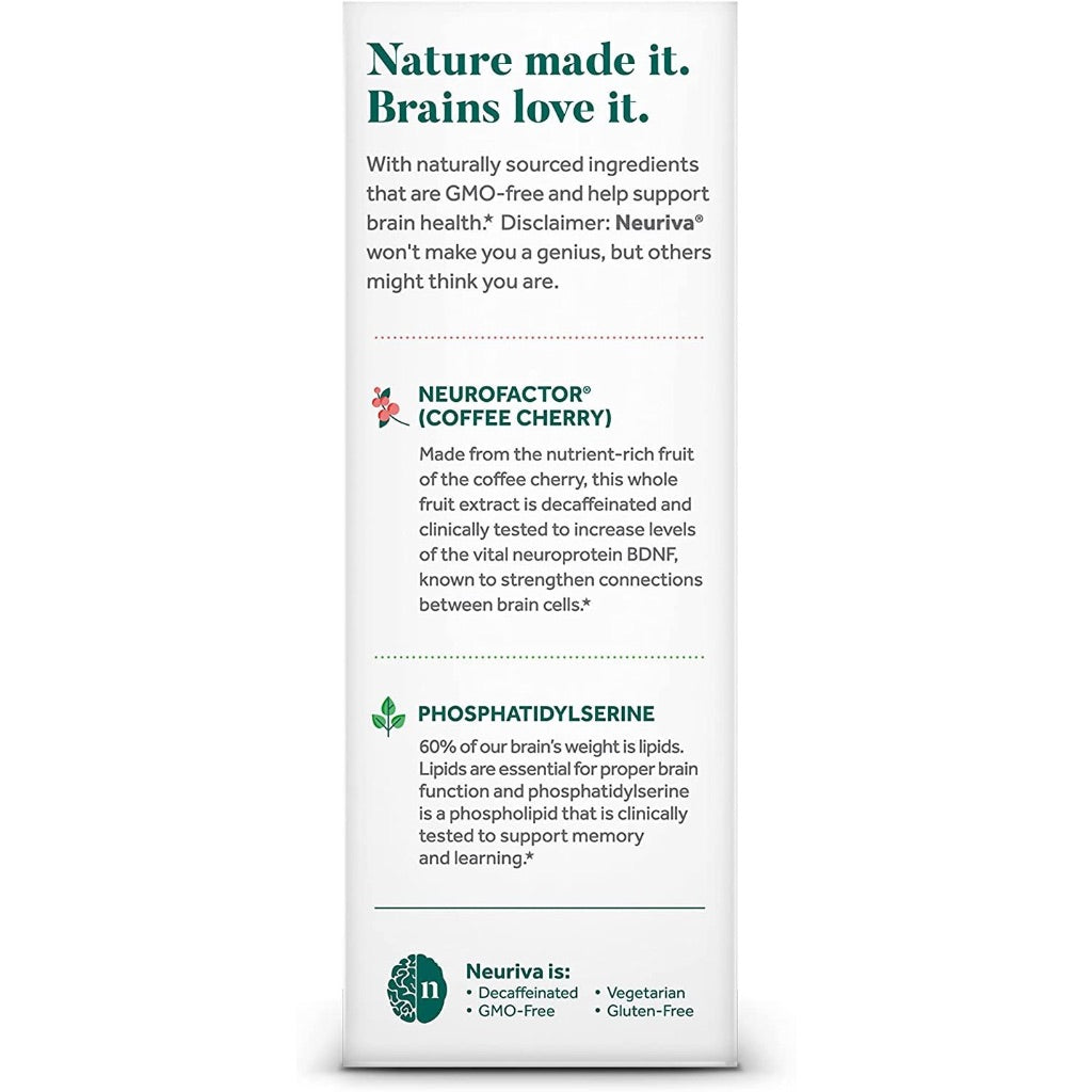 Neuriva Decaffeinated Brain Supplement is a nootropic dietary supplement designed to support adult cognitive function. It contains a 28-count supply of vegetarian capsules. The formula features clinically tested, naturally sourced ingredients including Neurofactor, an extract derived from coffee cherry, and plant-sourced Phosphatidylserine. These components are intended to support memory, focus, and learning by promoting neuron health and supporting connections between brain cells. The supplement is decaffeinated, sugar-free, gluten-free, and suitable for vegetarians. It is manufactured in a GMP-certified facility. The recommended use for adults 18 years and older is one capsule daily.