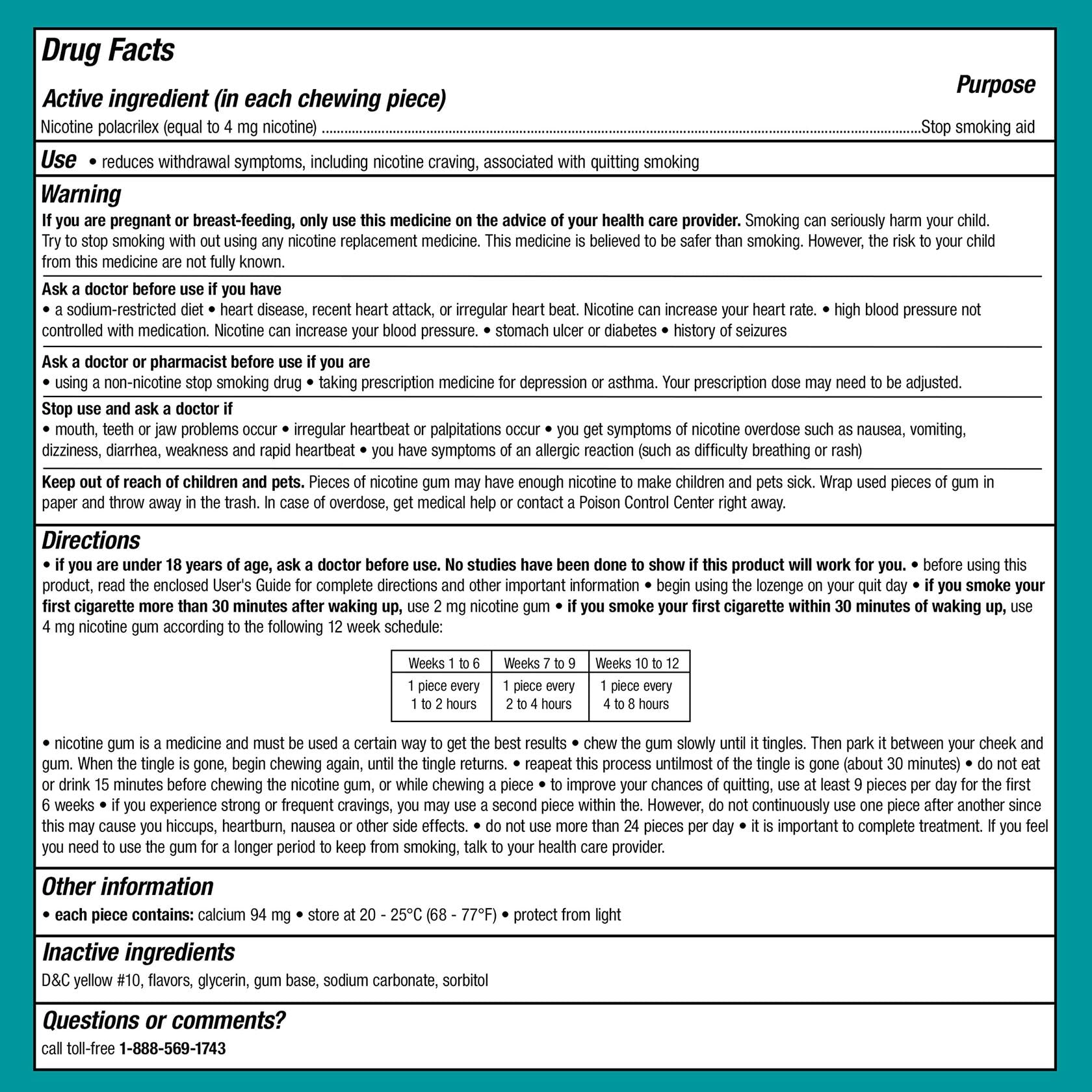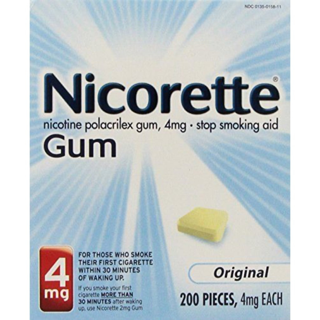 Nicorette Nicotine Gum 4mg in Original Flavor is a smoking cessation aid designed to help adults quit smoking. This product contains 200 pieces of nicotine polacrilex gum that delivers 4mg of nicotine per piece to help reduce nicotine cravings and withdrawal symptoms. The gum utilizes a chewing technique where users chew slowly until they notice a peppery taste or slight tingling sensation, then park the gum between their cheek and gum to allow nicotine absorption through the oral mucosa. This nicotine replacement therapy (NRT) product helps manage cravings without the harmful toxins found in cigarette smoke. The original flavor provides a fresh, minty taste. Suitable for adults who smoke their first cigarette within 30 minutes of waking up. Users should follow the recommended step-down dosing program over 12 weeks for optimal results.
