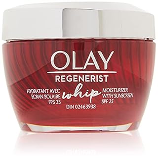 Olay Regenerist Whip Face Moisturizer with SPF 25 is a lightweight daily facial moisturizer designed to provide hydration and sun protection. Formulated with Active Rush Technology, it transforms from a cream to a liquid upon application for easy absorption without a greasy or sticky feel. It contains an Advanced Amino-Peptide Complex II to help improve skin elasticity and firmness, while diminishing the appearance of fine lines and wrinkles. The formula offers broad-spectrum SPF 25 protection against UVA and UVB rays. The moisturizer provides a smooth, matte finish and is suitable for daily use. The product comes in a 1.7-ounce container.