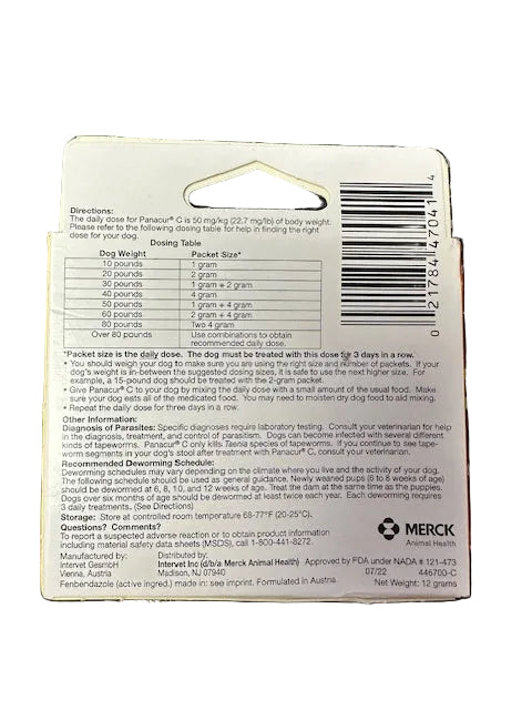 Panacur C Canine Dewormer is a broad-spectrum anthelmintic medication for dogs. The active ingredient is fenbendazole, which is effective against roundworms (ascarids), hookworms, whipworms, and Taenia species of tapeworms. It is formulated as a granule that can be easily mixed with a small amount of the dog's regular food. Each 4-gram packet is designed to treat dogs weighing up to 40 pounds. The product is suitable for use in dogs and puppies six weeks of age and older, including pregnant females. It is available in a pack containing six individual 4-gram packets, providing a complete treatment regimen for larger dogs or multiple treatments for smaller dogs. This over-the-counter formula contains the same active ingredient found in prescription dewormers and is FDA-approved for safe and effective at-home use.