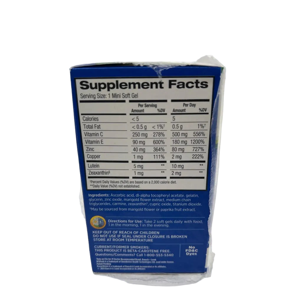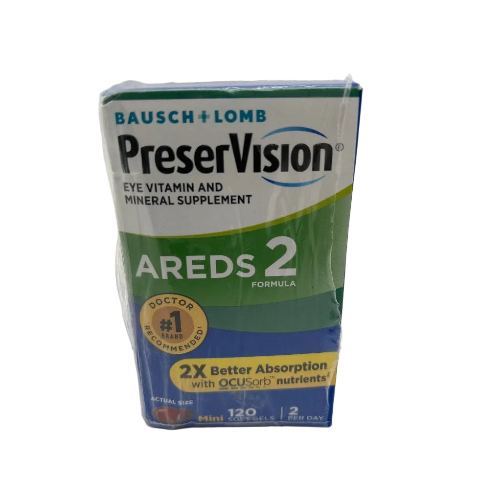 Bausch + Lomb PreserVision AREDS 2 Formula is an eye vitamin and mineral supplement specifically developed based on the National Eye Institute's Age-Related Eye Disease Study 2 (AREDS 2). This formulation contains essential nutrients including lutein (10 mg), zeaxanthin (2 mg), vitamin C (500 mg), vitamin E (400 IU), and zinc (80 mg) to help support eye health. The AREDS 2 formula is clinically shown to reduce the risk of progression of age-related macular degeneration (AMD) in people with intermediate to advanced AMD. Each bottle contains 120 soft gels, providing a 60-day supply when taken as directed (two soft gels daily). The supplement features a specific antioxidant and mineral combination that clinical research has shown to be beneficial for maintaining macular health. The soft gel format allows for easy swallowing and optimal nutrient absorption. This formulation replaces the original AREDS formula with lutein and zeaxanthin instead of beta-carotene, making it suitable for smokers and former smokers.