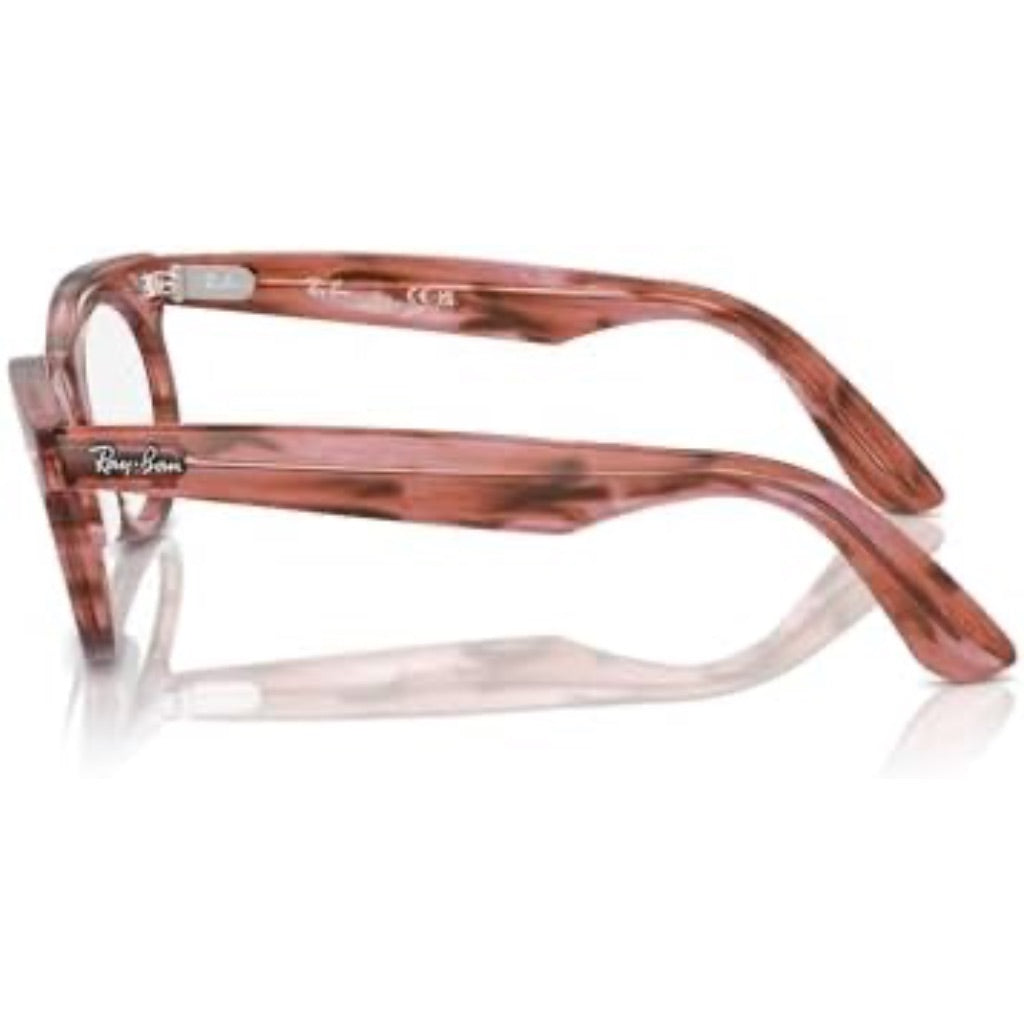 FRAME FEATURES: RX2242V Wayfarer Oval eyeglass frames feature an oval, striped transparent pink frame with metal front rivets.