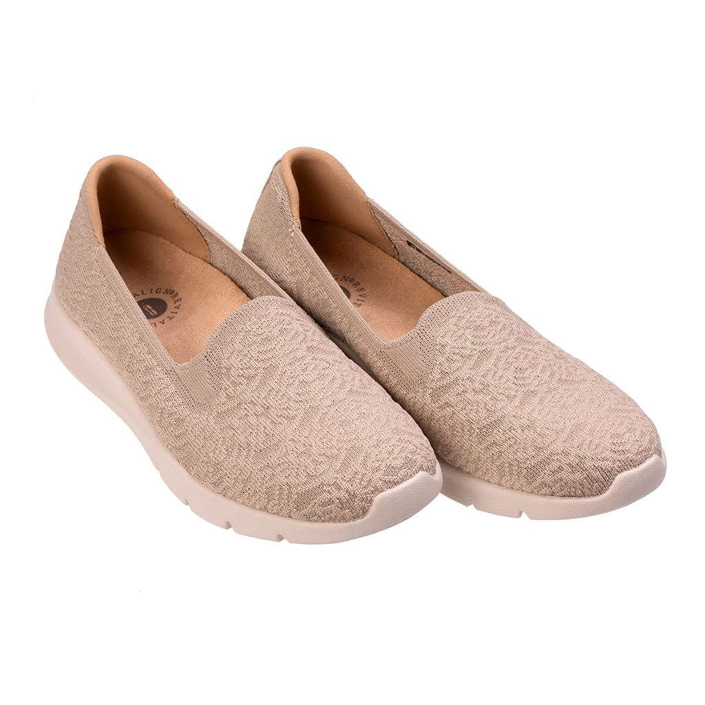 The Revitalign Women's Comfort Stretch Damask Sesame is a casual slip-on shoe designed for all-day comfort and orthotic support. This shoe features a detailed damask pattern on a lightweight, stretchable upper material for easy wear and a flexible fit. It incorporates the proprietary Revitalign Full Contact Comfort Footbed, an orthotic-grade insole biomechanically designed to reduce overpronation, alleviate pain from conditions like plantar fasciitis, and provide superior support for the feet and body. The shoe is constructed with a cushioned EVA midsole for shock absorption and a non-marking, non-slip rubber outsole for reliable traction and durability. Approved by the American Podiatric Medical Association (APMA), this traditional silhouette offers a versatile style suitable for transitioning from weekday activities to weekend wear.