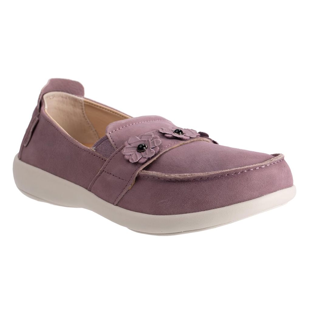The Revitalign Women's Siesta Flower Slip-On Shoe in Elderberry is a stylish and comfortable footwear option designed for women. It features a silky soft suede upper with a decorative floral detail, embodying a timeless and feminine style suitable for special occasions or everyday wear. The shoe incorporates the Revitalign® Footwear technology and a Full Contact Comfort® Footbed, which provides orthotic-grade support to help reduce overpronation, alleviate plantar fasciitis, and address other foot and body pains. This biomechanically designed footbed is approved by the American Podiatric Medical Association (APMA). Additional features include a cushioned EVA midsole for shock absorption and a non-marking, non-slip rubber outsole that offers reliable grip and stability. The slip-on design ensures easy wear, making it a convenient choice for all-day comfort throughout the year.