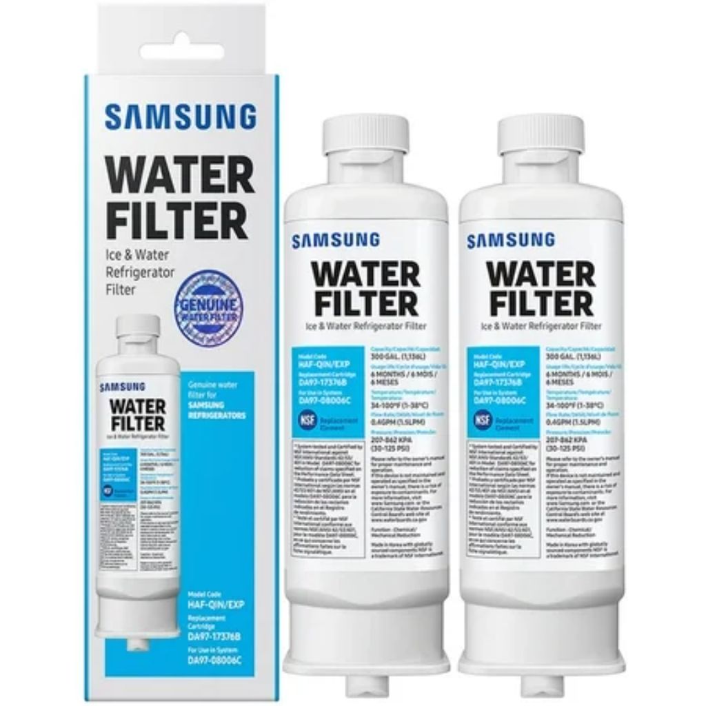 The Samsung HAFQIN2P is a genuine 2-pack of refrigerator water filters designed for compatible Samsung refrigerator models. This concentrated carbon filter is engineered to effectively reduce over 99% of potentially harmful contaminants, including lead, mercury, asbestos, and pharmaceuticals, from drinking water and ice. It helps protect the refrigerator's internal components from scale and sediment buildup, which can extend the appliance's lifespan. The filter also works to eliminate unpleasant tastes and odors, such as chlorine, for cleaner, fresher-tasting water. Samsung genuine filters are manufactured in both Korea and Mexico to meet the brand's quality standards. This 2-pack offers convenience by providing a replacement filter for immediate use when the current one expires, typically after approximately six months or 300 gallons of use, depending on water quality and consumption.