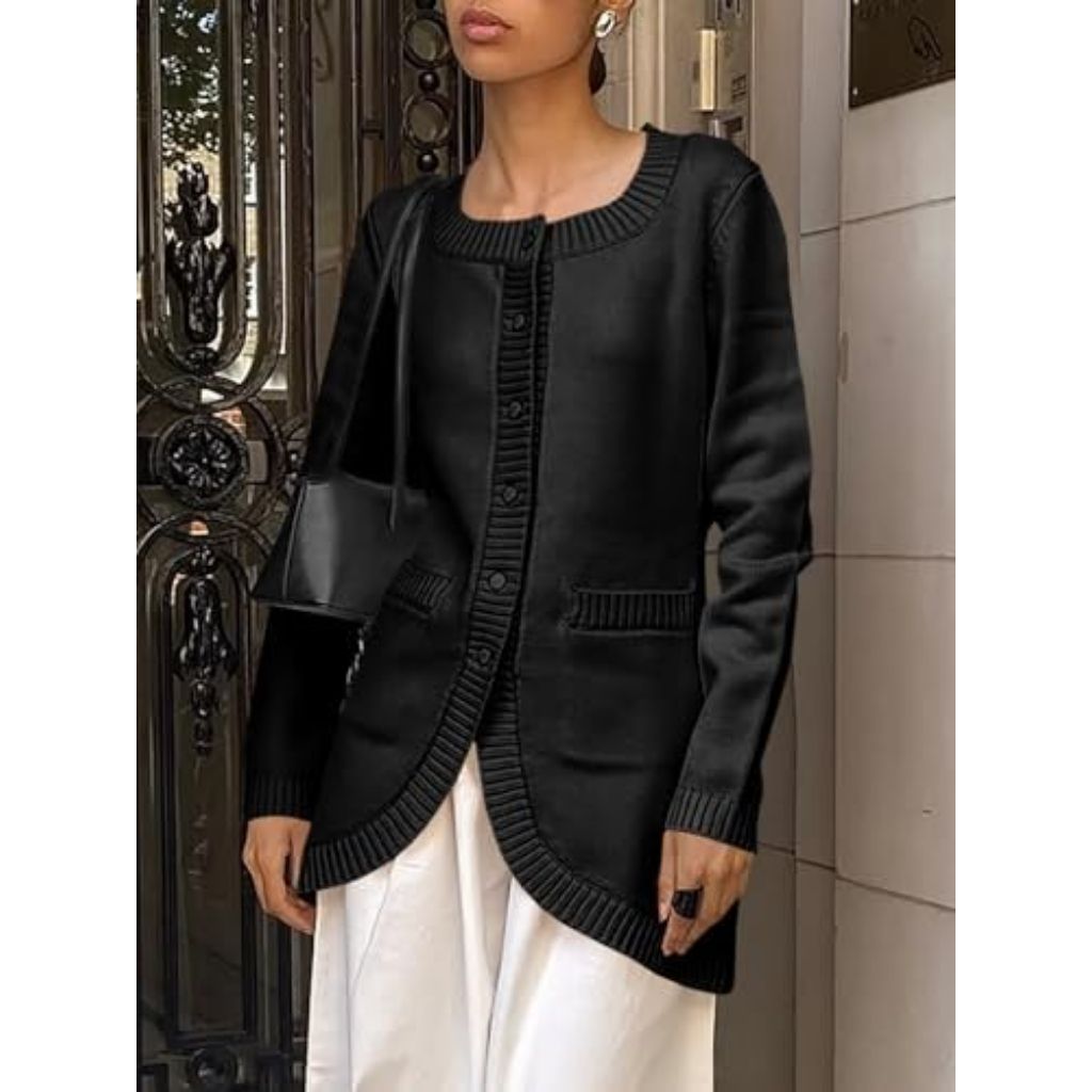 The Saodimallsu Women's Button Down Cardigan is a long-sleeve, crew neck sweater designed for casual wear. It is constructed from a soft, ribbed knit fabric that provides a comfortable and cozy feel while offering breathability and durability. The cardigan features a button-down front closure, a loose fit, and a curved front hem. Details include ribbed trim at the closure, cuffs, and neckline, along with two functional front pockets. Its solid color and versatile design make it suitable for layering over blouses, t-shirts, or dresses. This open-front cardigan is intended for various occasions, including casual outings, office settings, school, or leisure activities during the fall and winter seasons. Care instructions recommend washing in cold water, avoiding bleach, and laying flat or hanging to dry.