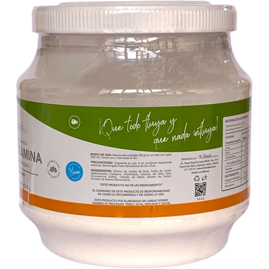 Shelo Nabel Hydrolyzed Collagen with Glucosamine and Key Lime Juice is a dietary supplement designed to support joint, bone, and skin health. The product contains hydrolyzed collagen peptides, which are easily absorbed by the body to help maintain healthy connective tissues, improve skin elasticity, and strengthen hair and nails. It is enhanced with glucosamine to support joint cartilage and lubrication, potentially alleviating joint discomfort. The addition of key lime juice provides a citrus flavor and contains vitamin C, which is essential for collagen synthesis. This supplement comes in a 15.87 oz (450g) container and is intended to be mixed with water or other beverages. The product label and packaging are in Spanish.