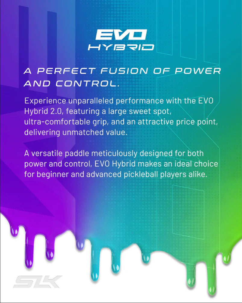 The SLK Evo Hybrid 2.0 XL is a high-performance pickleball paddle designed for players of all skill levels. It features an upgraded SpinFlex surface technology engineered to generate enhanced spin and ball control. The paddle offers a large sweet spot for consistent, forgiving shots and is constructed with a hybrid core that balances power and touch. It comes with an ultra-comfortable grip designed to reduce vibration and improve handling during extended play. The paddle is suitable for both recreational and competitive play, providing excellent value through its combination of advanced features and performance.
