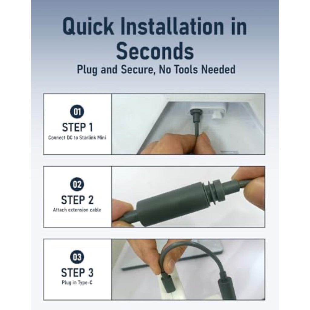 The Starlink Mini USB-C to DC Extension Cable is a specialized power adapter designed to connect the Starlink Mini satellite internet terminal to various portable power sources. It features a USB-C male connector on one end and a waterproof female DC connector on the other, with an 18cm cable length. The adapter is engineered to work with 65W or higher USB-C Power Delivery (PD) sources, including compatible wall chargers, power banks, and car adapters. It incorporates a built-in smart power management chip to ensure stable voltage output and prevent signal interruptions due to power fluctuations. The DC port features a twist-and-lock mechanism for a secure, waterproof connection, making it suitable for use in outdoor conditions such as rain, snow, or dusty environments. Its compact, lightweight design facilitates easy portability for travel, camping, and mobile applications, requiring no configuration for operation. FEATURES