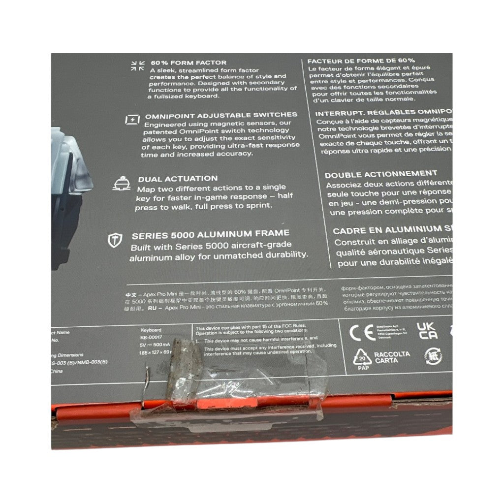 The SteelSeries Apex Pro Mini is a compact 60% gaming keyboard featuring advanced OmniPoint 2.0 adjustable mechanical switches. These magnetic Hall effect switches allow for customizable actuation points from 0.2mm to 3.8mm, enabling users to fine-tune keystroke sensitivity to their preference. The keyboard supports 2-in-1 action keys, allowing a single key to perform two different functions based on press depth. Constructed with a durable aircraft-grade aluminum alloy top plate, it offers enhanced rigidity and stability. It comes equipped with double-shot PBT keycaps for long-lasting durability and fade resistance. The compact design maximizes desk space while retaining full functionality through side-printed secondary functions. The keyboard is fully programmable via the SteelSeries Engine software, which allows for per-key RGB illumination customization, macro programming, and actuation point adjustments. It is designed for both gaming performance and typing accuracy.