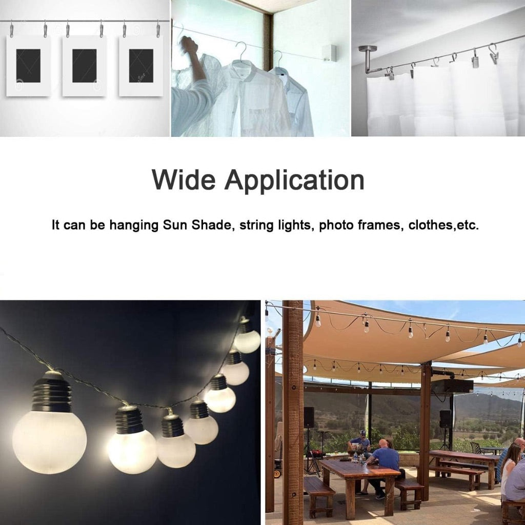 Durable and Dependable: Sun shade sail installation kit made of high quality 304 marine grade stainless steel, which is extremely strong and heavy-duty. It's safe to suspend your sun shade sail. Universal Application:Adjustable turnbuckles to create extra tension to make your sails get tight in installation.Fits most rectangle/square/triangle sun shade sails,such as 8'x10', 10'x13', 10'x10', 12'x12'.and also can be used in outdoor, patio, garden,trees,wall,porch Hardware kit include: Turnbuckle (2pcs), Diamond pad eye (4pcs), Carabineer/hook (2pc), Screws (16pcs),1x 30 FT wire rope cable,8x rope clamps.this sun shade sail hardware set will accommodate most kinds of the shade sail. Complete Hanging Kit:This kit has more you need.You can hang in many places, such as hanging Sun shade sail,hanging string lights, globe lights and curtain lanterns. photo frames, parking,dry clothes and facilities for sunbathe at day lot.