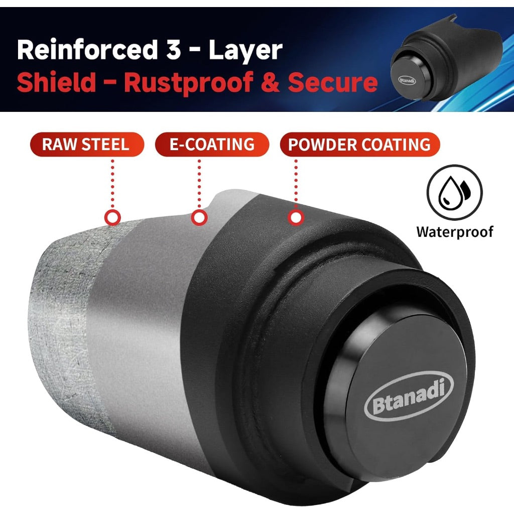 The Trailer Lock is designed to fit 2-inch couplers commonly found on RV, boat, and cargo trailers. Constructed from upgraded heavy-duty steel, this anti-theft device provides enhanced security against theft and unauthorized use. The lock features a pry-resistant design that helps prevent forced entry attempts. Its black finish offers corrosion resistance for outdoor use. The mechanism is engineered to securely engage with standard 2-inch trailer couplers, creating a reliable barrier against theft. This lock is suitable for various trailer types including recreational vehicles, boat trailers, and cargo haulers where security is a priority.