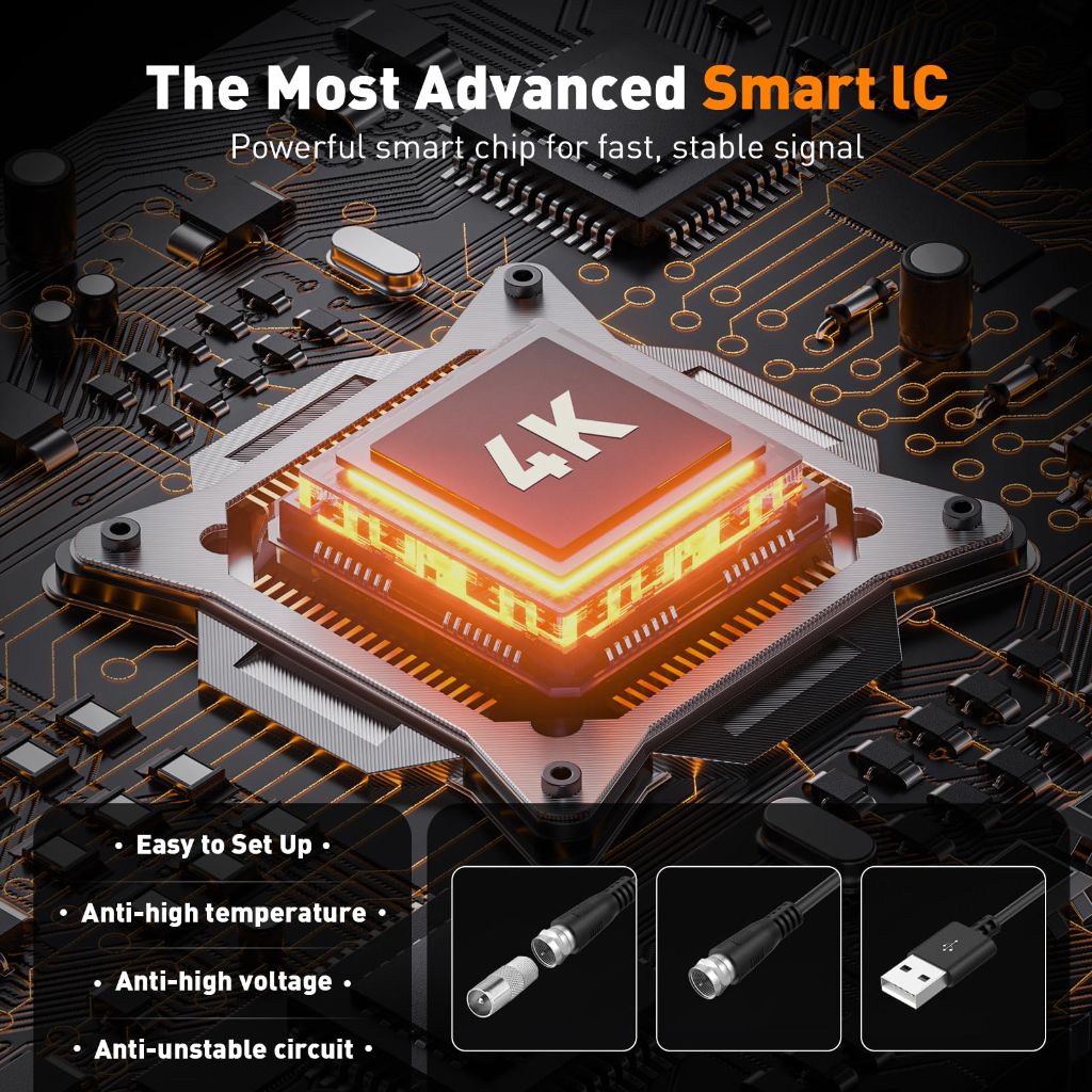 The Smart Antenna Indoor is a digital television antenna designed to receive over-the-air broadcast signals. It is marketed as capable of receiving channels from up to 600+ miles away, including major networks such as ABC, CBS, NBC, and FOX. The antenna supports high-definition formats including 4K and 1080p. It features 360-degree signal reception for enhanced channel capture. The included coaxial cable is designed for long-distance signal transmission. The antenna is intended for indoor placement, such as behind a television or near a window. It is compatible with televisions that have a built-in digital tuner. For older analog televisions, a separate digital converter box and a USB power adapter are required for operation.