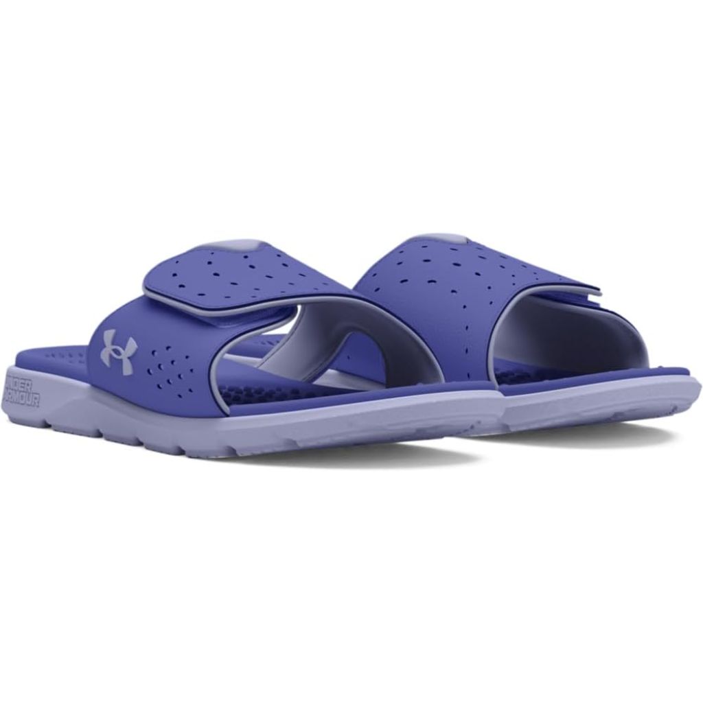 Under Armour Women's Ignite Pro Slides feature an adjustable synthetic strap with soft foam lining for enhanced comfort and perforations for improved breathability. The medial strap includes a strategic cut-out design to provide pressure point relief. These slides are equipped with a textured foam footbed that delivers exceptional comfort and support. The EVA outsole is lightweight and durable, featuring traction pods in the heel area for reliable grip and cushioning. Designed specifically for women, these slides offer a comfortable fit for casual wear and post-activity recovery.