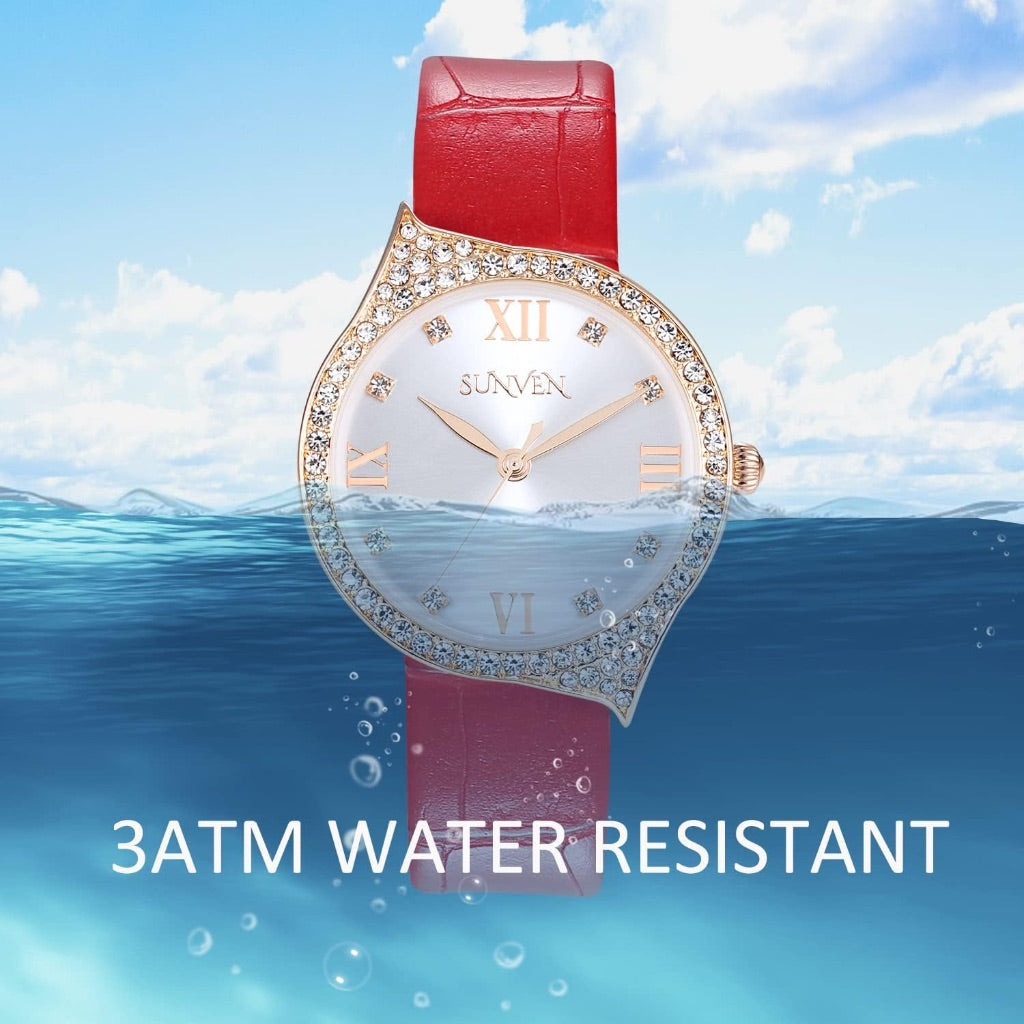 Sunveb Women's Bling Diamond Quartz Wrist Watch, Red Leather Strap, Rose Gold Case