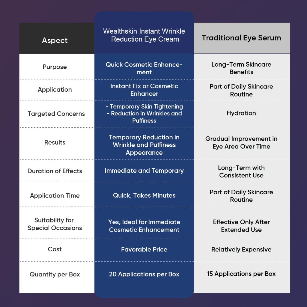 The WealthSkin Instant Rapid Wrinkle Eye Cream is a fast-acting topical cosmetic product designed to temporarily reduce the appearance of wrinkles and fine lines around the eyes, face, and neck. This 30 mL cream utilizes film-forming agents that create a tightening effect on the skin's surface, smoothing out wrinkles and temporarily diminishing puffiness. Users can expect to see initial results within 60 seconds of application, with more pronounced effects appearing within 10 minutes, potentially creating a more youthful appearance. The temporary firming results are designed to last for approximately 8 to 10 hours. For optimal use, apply a small amount of the cream to cleansed skin on the targeted areas using a gentle tapping motion. It is recommended to maintain a neutral facial expression for about 3 minutes as the product dries. During this time, a temporary tightening sensation may be felt as the formula sets. To avoid a whitish residue, use sparingly and smooth away any excess with a damp fingertip.