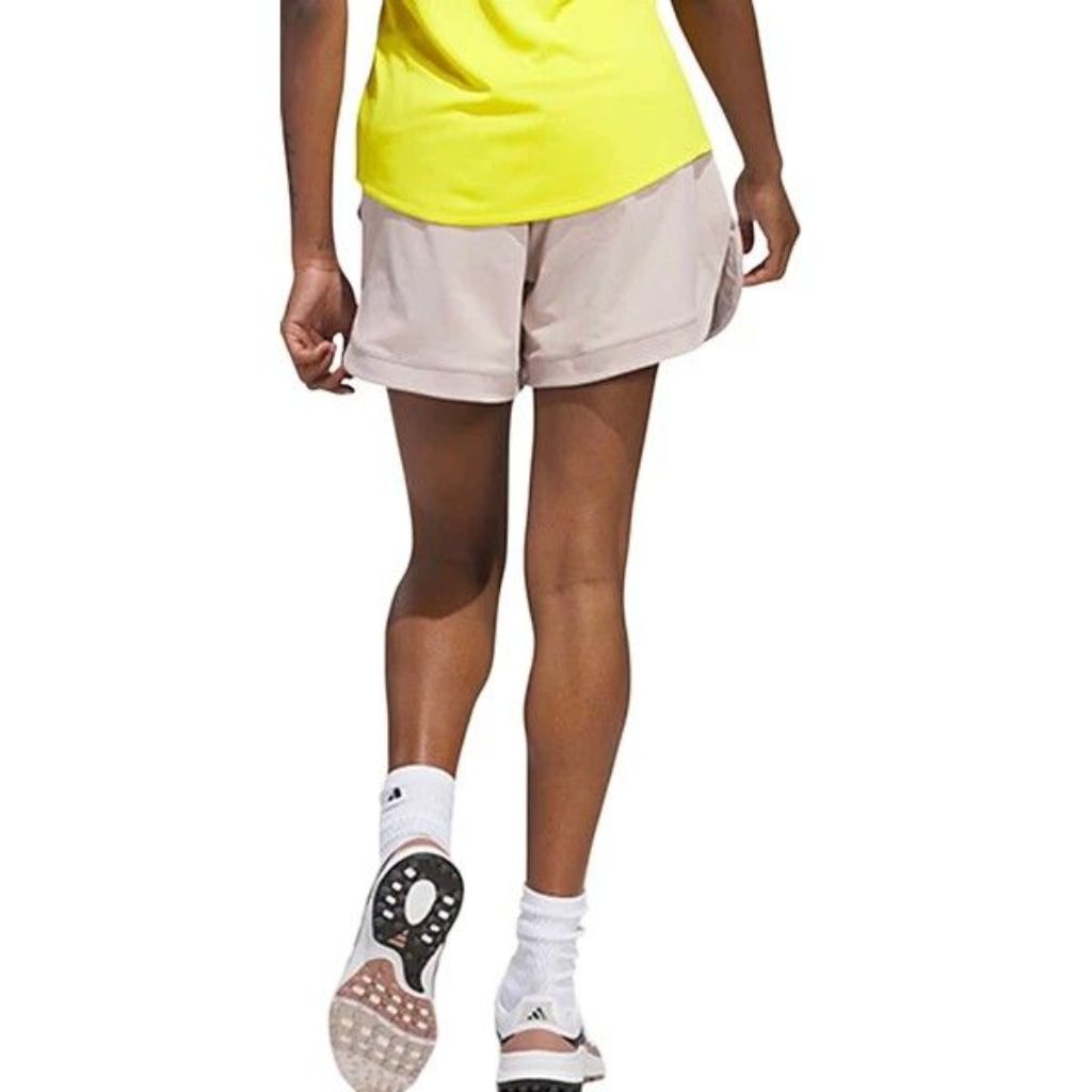 The Adidas Beyond Shorts are versatile women's golf shorts crafted from 100% recycled materials, designed for comfort both on and off the course. They feature a loose, relaxed fit with an elastic waistband for easy wear and unrestricted movement. A key functional element is the attached undershorts, which provide coverage and freedom during activities like bending and swinging. The shorts are suitable for the golf course, clubhouse, and casual wear, making them a transitional piece for various parts of your day. By utilizing recycled content, this product supports sustainability efforts by reducing waste and the consumption of new raw materials.