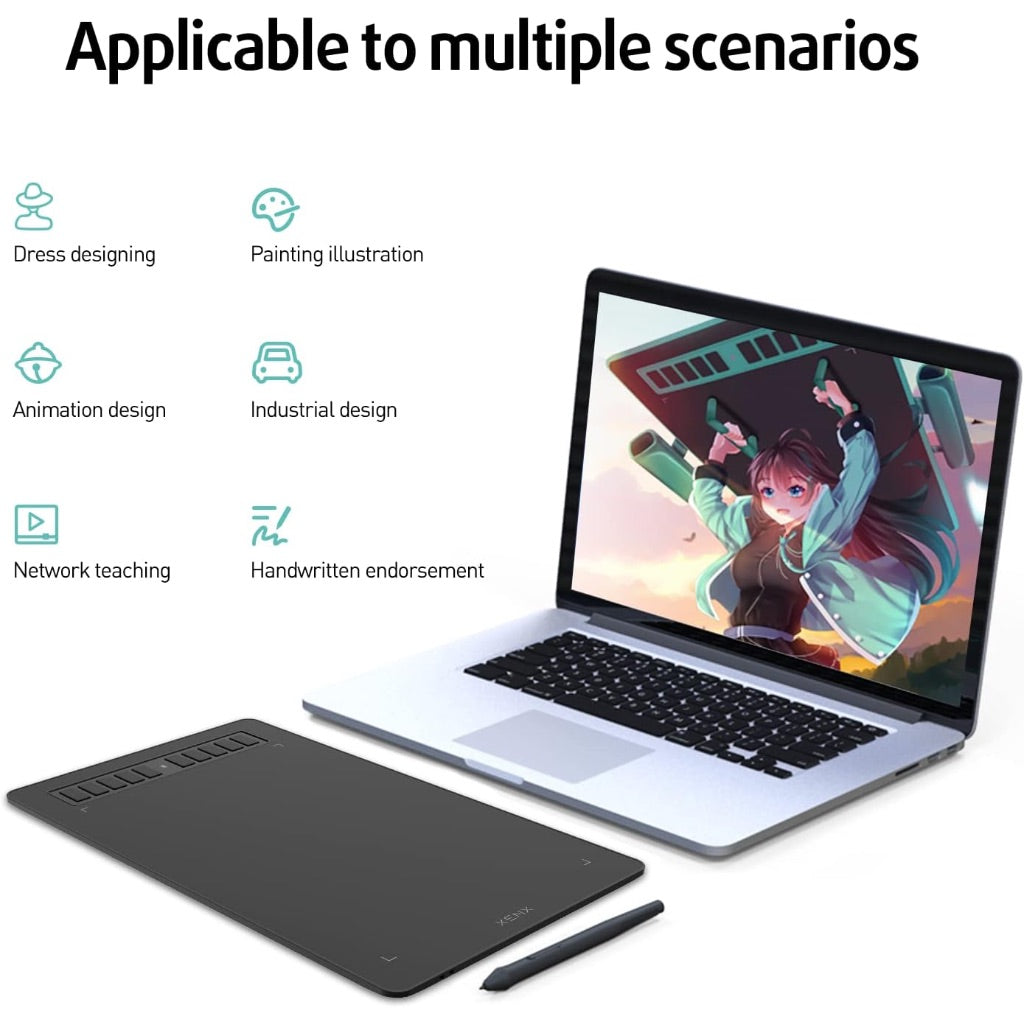 The XENX P3-1060B is a 10x6 inch graphic drawing tablet designed for digital art creation, design work, and gaming applications like OSU. It features a compact active drawing area with 8192 levels of pressure sensitivity, providing precise control over line thickness and opacity based on drawing pressure. The tablet includes a battery-free stylus that requires no charging, offering uninterrupted creative sessions. Ten customizable shortcut keys allow for quick access to frequently used functions, improving workflow efficiency. This drawing tablet is compatible with multiple operating systems including Windows, MacOS, and Android devices, making it versatile for use with computers, phones, and tablets. The tablet is suitable for digital painting, photo editing, animation, sketching, and note-taking applications.