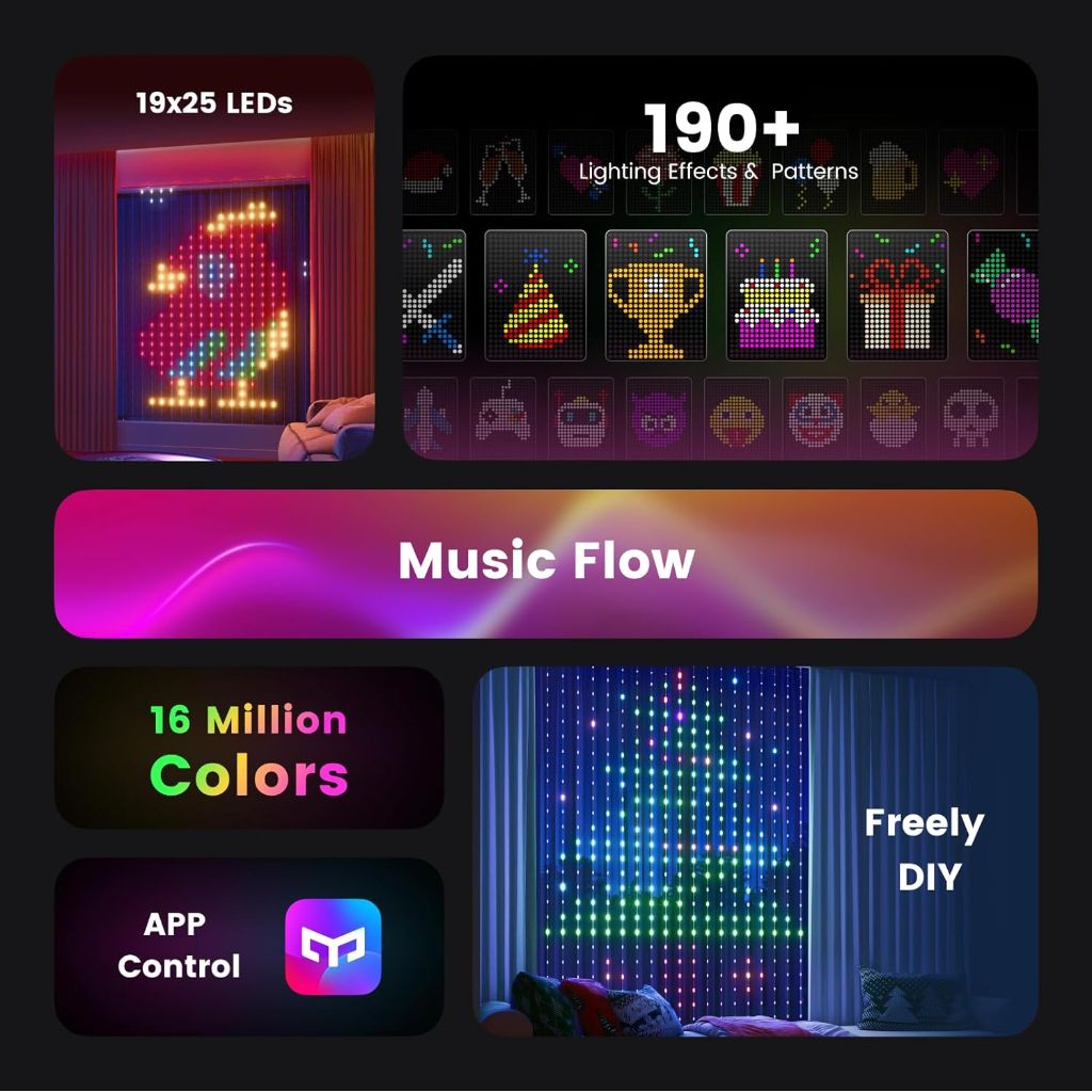 The Yeelight Smart Curtain Lights are a decorative lighting system featuring a large 5x6.5 foot panel with 475 individually addressable LEDs. These smart lights connect via Bluetooth to the Yeelight mobile application, providing users with control over lighting effects and customizable displays. The system offers over 20 dynamic light scenes and more than 100 static patterns with access to 16 million color options. A Music Flow feature enables synchronization with audio, creating visual effects that respond to music spectrum and rhythm. Constructed with IP65 waterproof rating, these lights are suitable for both indoor and outdoor use in temperatures ranging from -4°F to 140°F. Multiple installation options are provided including hooks, adhesive tapes, and nails for flexible mounting on walls, windows, or outdoor surfaces. The curtain lights serve as versatile decorative lighting for various applications including holiday decorations, party ambiance, bedroom accent lighting, dorm room decor, and living room enhancement.