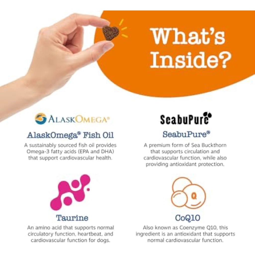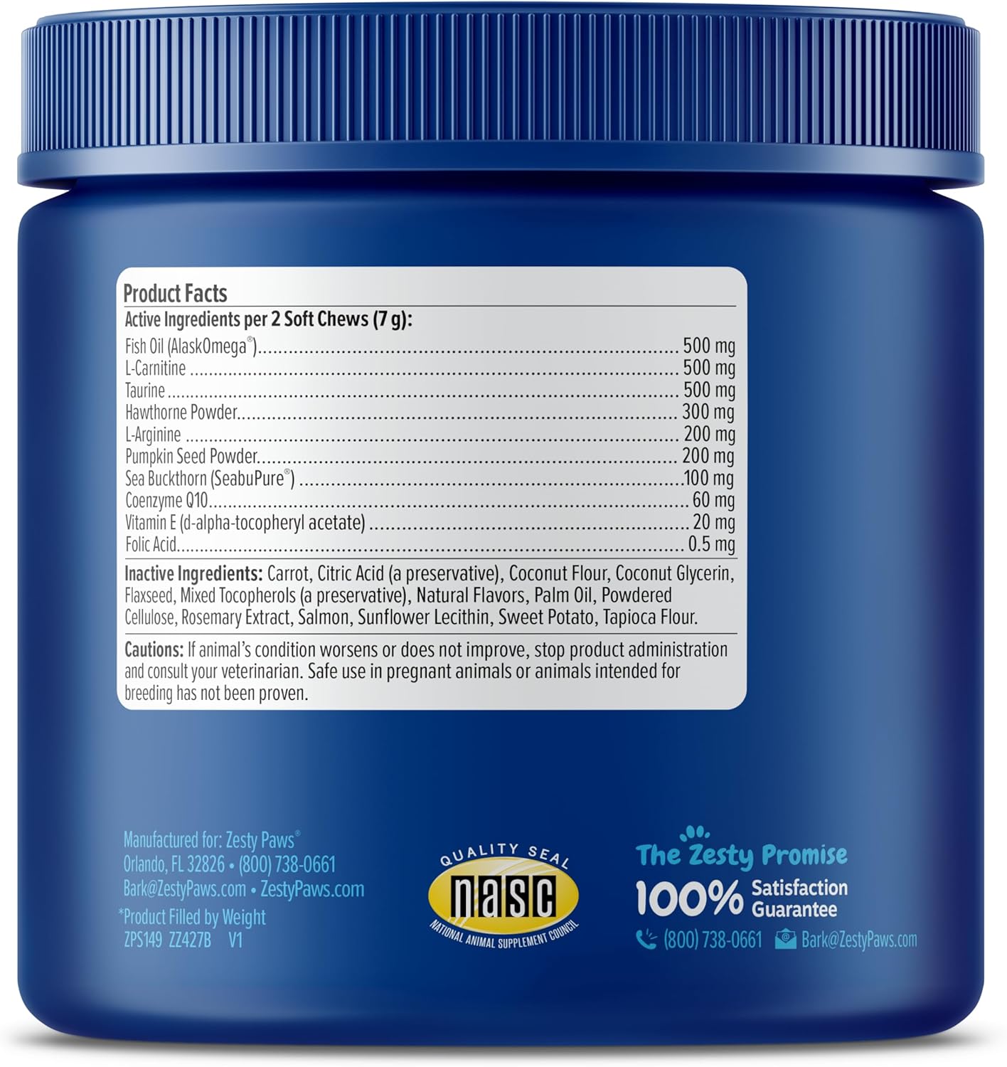 Zesty Paws Senior Advanced Cardio Bites are soft chew supplements designed to support cardiovascular health in senior dogs. This formula contains Taurine and L-Carnitine, which work together to support normal circulatory function, heartbeat, and cardiac muscle function. It includes premium, sustainably sourced AlaskOmega fish oil to provide Omega-3 fatty acids (EPA and DHA) for cardiovascular support. The supplement features SeabuPure, a premium form of Sea Buckthorn that supports circulation and provides antioxidant protection. Additional beneficial ingredients include CoQ10, Hawthorne Powder, L-Arginine, Pumpkin Seed Powder, Folic Acid, and Vitamin E, which contribute to heart, immune, and antioxidant support. Each container contains 90 soft chews.